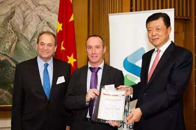 中国驻英大使刘晓明为宁诺执行校长Chris Rudd颁发 "破冰者"称号以肯定其对于中英友好合作的贡献