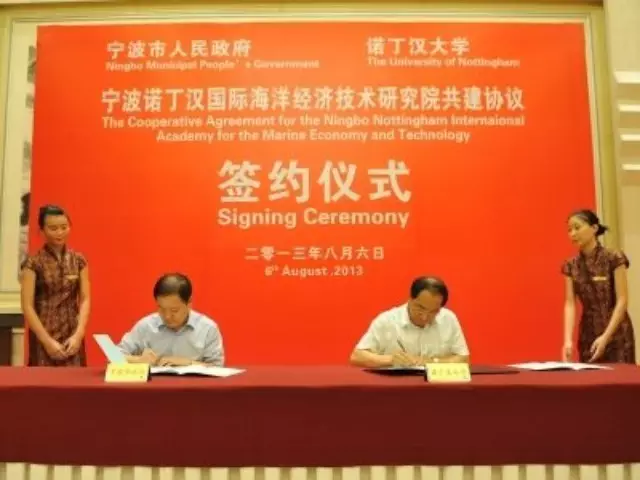 宁波市政府、宁波诺丁汉大学、英国诺丁汉大学和浙江省万里教育集团共同签约,合作共建宁波诺丁汉国际海洋经济技术研究院